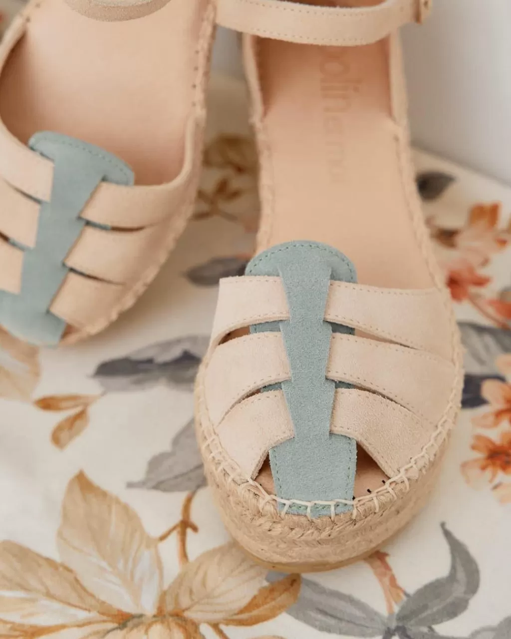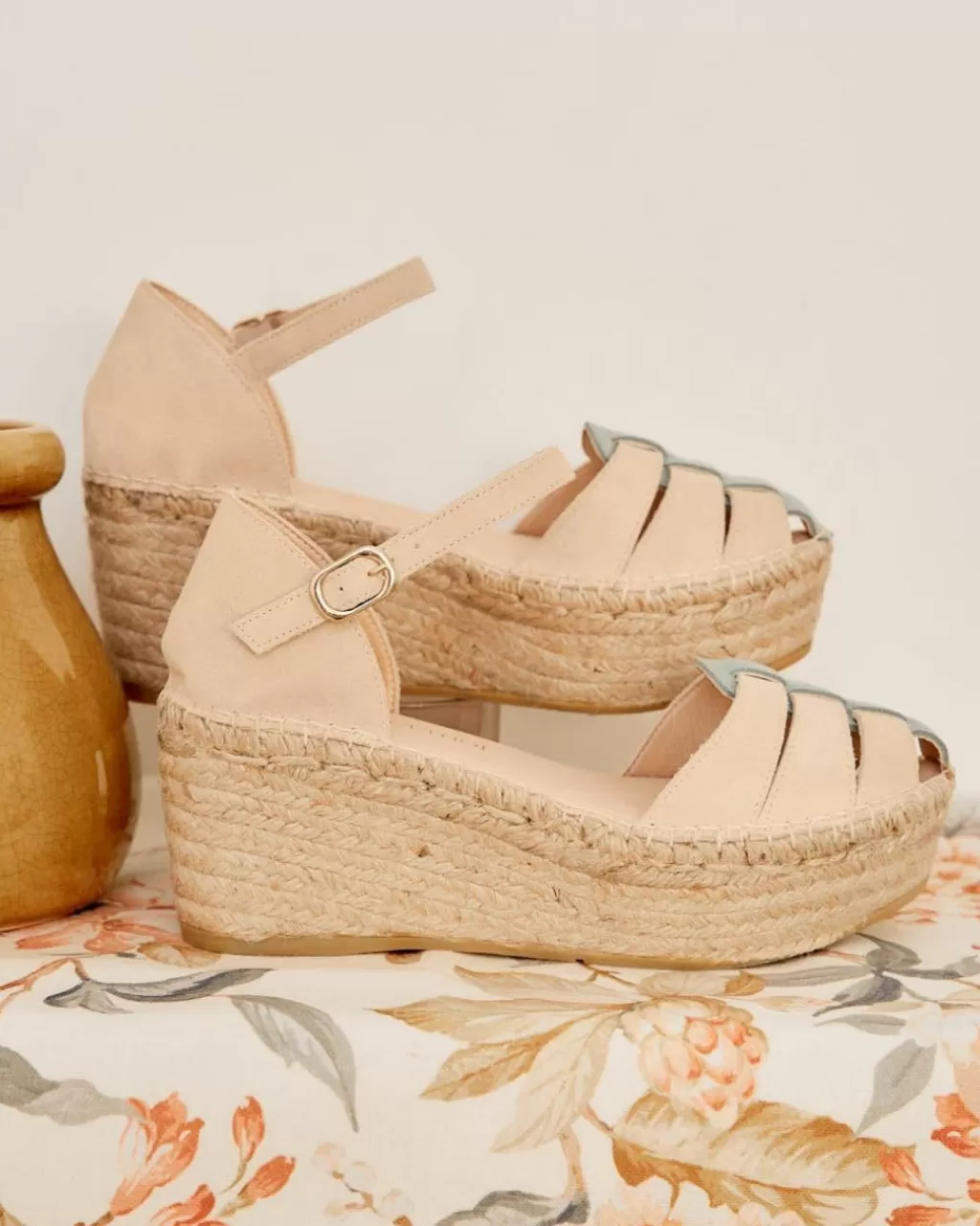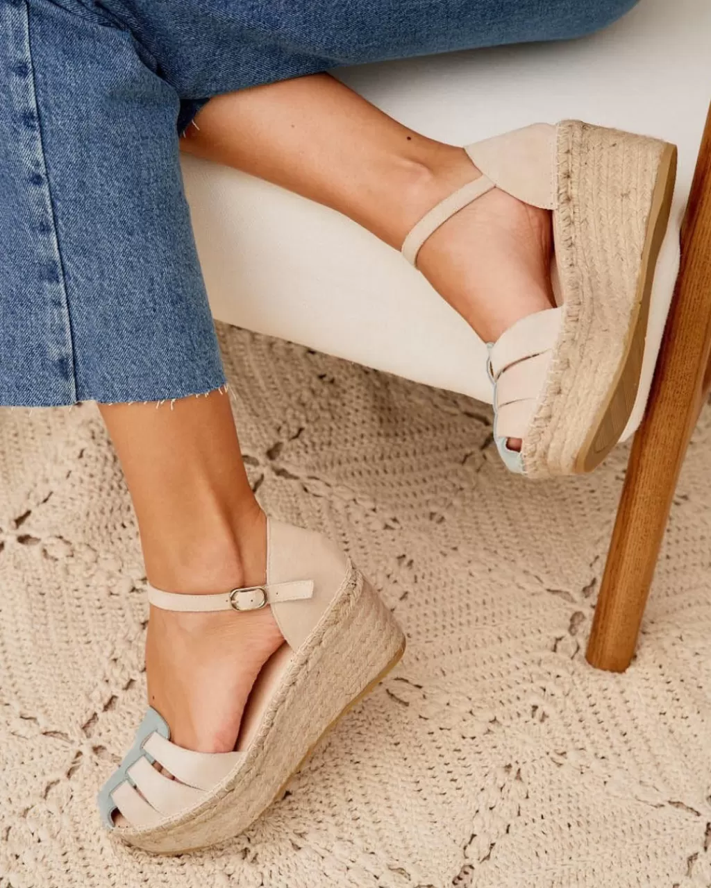 Cangrejera de piel de serraje con plataforma en color crudo. Punta ligeramente redondeada con una tira central en color denim. Talón cubierto y cierre con pulserilla y hebilla. Interior de piel. Fabricación española de yute natural. La plantilla tiene una almohadilla para mayor comodidad. Una alpargata perfecta para combinar con tu vestido o jean favorito.
