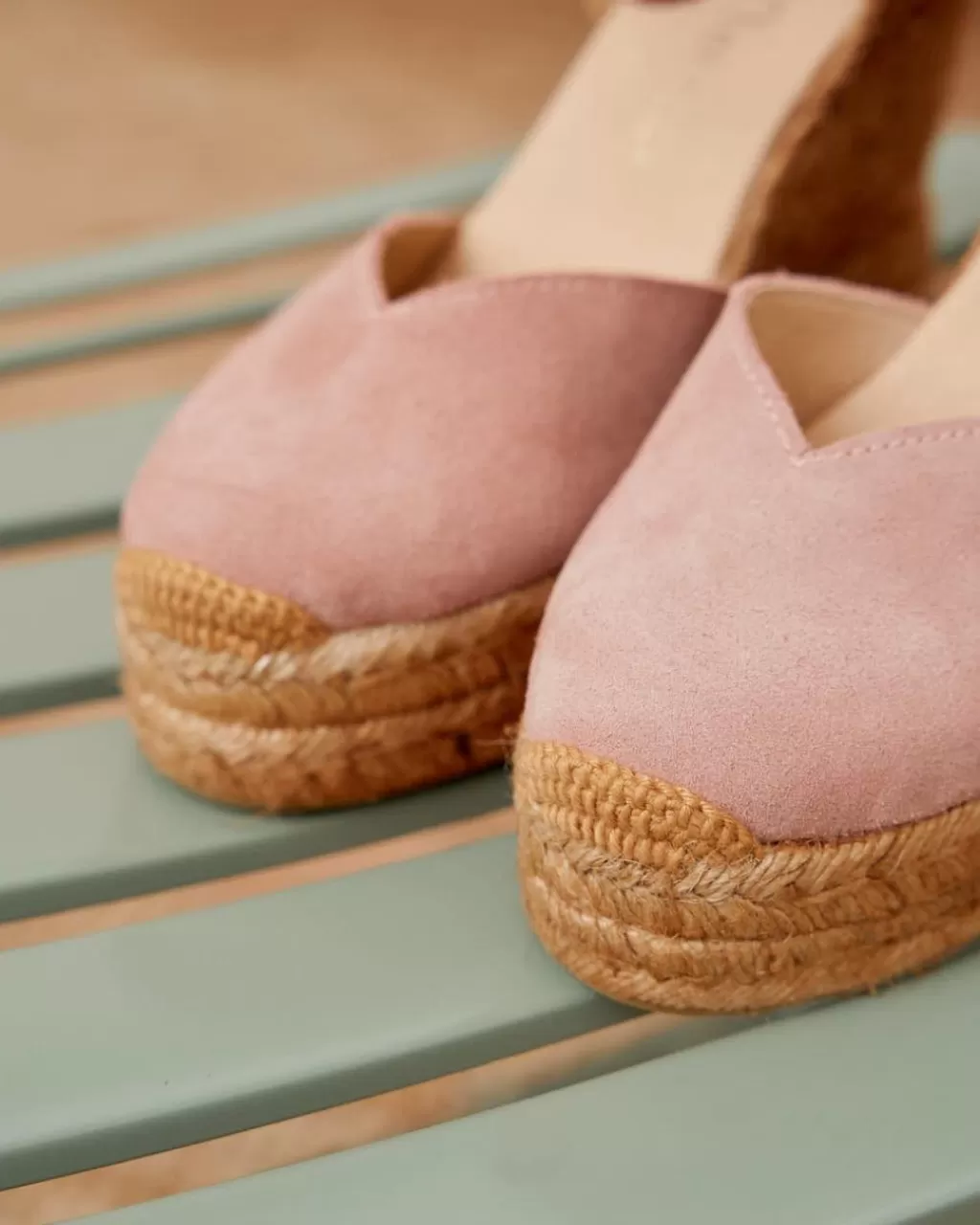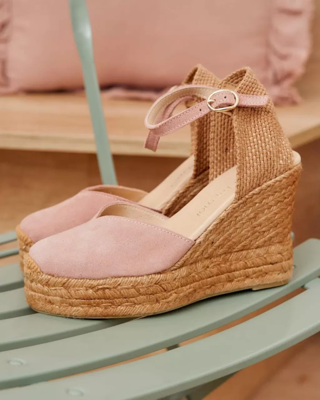 Alpargata de plataforma en serraje de color rosa. Sujeción al tobillo con pulsera y cierre con hebilla. Escote abierto en forma de corazón. Talonera cosida con hilo y esparto. Fabricación española de yute natural. La plantilla tiene una almohadilla para mayor comodidad. Una alpargata ideal para elevar cualquier look esta temporada. Diseñado y fabricado en España.