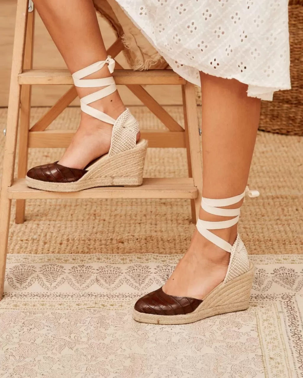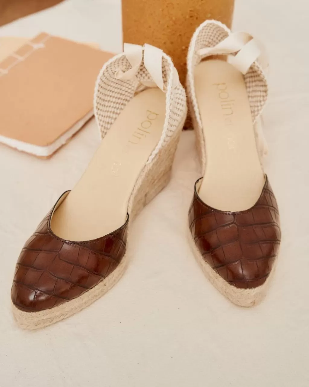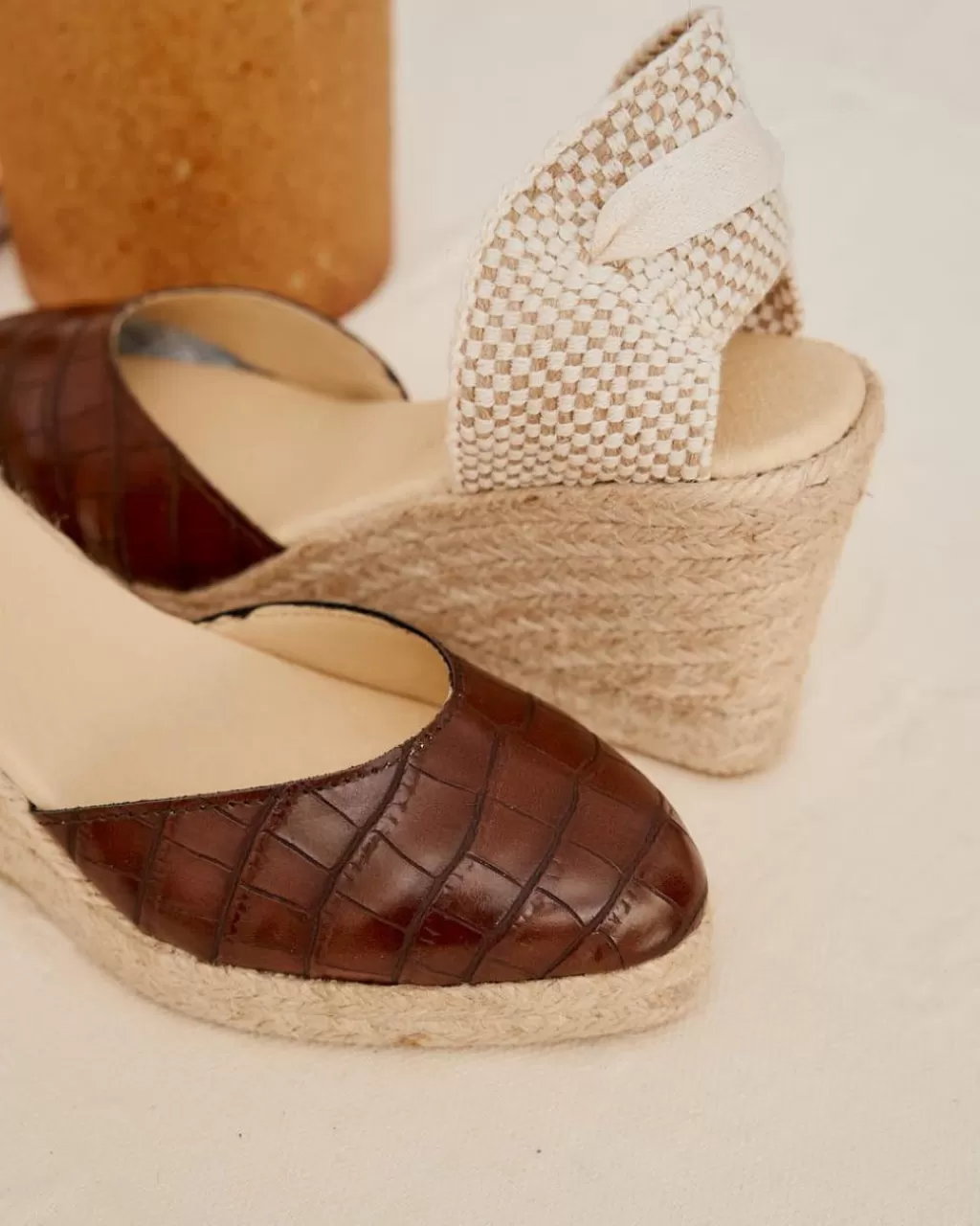 Alpargata de piel con efecto irregular en color marrón. Puntera ligeramente en punta. Diseño de cuña con cintas en color crudo para anudar cómodamente. Talonera de cosida con hilo y esparto. Fabricación artesana de yute natural en un tono clarito. Plantilla de la alpargata con almohadilla para mayor comodidad. Un diseño diferente y muy estiloso darle un toque especia a tu look en cualquier ocasión. Diseñado y fabricado en España.