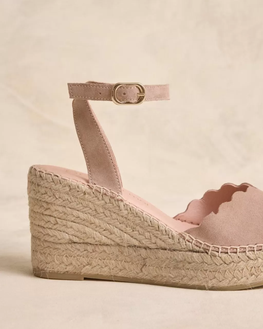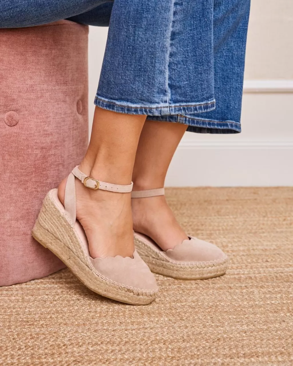 Alpargata de cuña en serraje en color nude. Puntera redondeada. Escote en corazón con pequeñas ondas. Cierre mediante correa con hebilla al tobillo. Fabricación española de yute natural. La plantilla tiene una almohadilla para mayor comodidad. Una alpargata original que puedes combinar con tus looks favoritos esta temporada.
