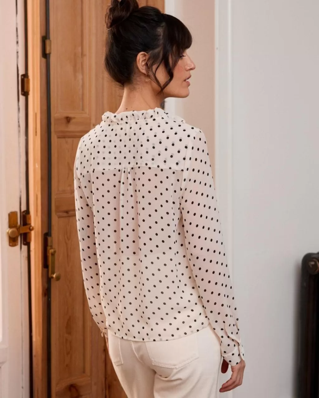 Blusa con estampado de lunares. Cuello redondo con detalle de volante. Modelo de manga larga recta con final en puño. Hilera de botones desde el cuello hasta el bajo. Cuerpo recto. Blusa con toque romántico y perfecta para el día a día. Ver másVer menos Referencia 180243 COMPOSICIÓN Y MEDIDAS:100% PoliésterBego mide 1,78 cm y lleva talla S. Si dudas con la talla te recomendamos usar el recomendador online.CUIDADOS:Lavar a mano. Ficha técnica Colores BLANCOS Etiquetas: EMM N572461 – ENVÍOS, CAMBIOS Y DEVOLUCIONES Favorito216 ENVÍOS:Todos los envíos cuentan con gastos de envío, que dependen de la dirección de entrega.• Península y Portugal: 3,50€ | 2-4 días laborables.• Baleares: 6,50€ | Hasta 7 días laborables.• Países de la Unión Europea: 10,95€ | Hasta 10 días laborables.• Envíos a Europa (No UE): 15,95€ | Hasta 10 días laborables.• Resto del mundo*: Aprox 10€ | Hasta 15 días laborables.*NO hacemos envíos a Canarias, Ceuta, Melilla, Afganistán, Bielorusia, Congo, Bali, Myanmar, Nigeria, Rusia, Senegal, Somalia y Ucrania.¡Importante! En periodo de rebajas, los pedidos pueden tardar un poco más de lo habitual ¡Rogamos paciencia!CAMBIOS: ¡El envío con el cambio solicitado es gratuito!Pedidos realizados desde España:Plazo de 14 días laborables desde que recibes el paquete en casa.Pedidos realizados desde fuera de España:Plazo de 20 días naturales desde que realizamos el envío.*La gestión del envío del paquete de vuelta a nuestro almacén corre a cuenta del cliente, haciéndose cargo de los costes de este envío, mediante el courier de su elección o con nuestro servicio de DHL.En el primer trámite de cambio, el envío de vuelta es gratuito (tanto de talla como de producto). Permitimos DOS trámites de cambio, en caso de querer tramitar un segundo cambio, se descontarán los gastos de envío según destino.Una vez recibido el paquete en nuestro almacén, tramitaremos tu cambio en un plazo máximo de hasta 10 días laborables. Recibirás un correo de confirmación cuando este pedido de cambio esté listo para ser enviado.