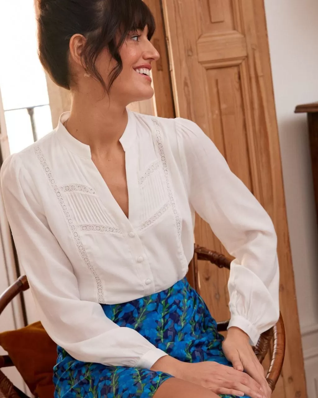 Camisaen color blanco con detalle de encaje en la parte superior. Cuello de pico. Manga larga con el final en puño. Hilera de botones desde el cuello hasta el bajo. Cuerpo recto. Camisa versátil, tanto para el día a día, como para una ocasión especial.