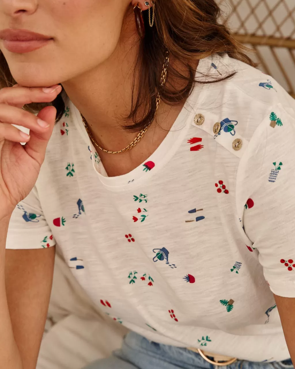 Camiseta blanca con dibujos estampados de plantas y regaderas. Cuello redondo con tres botones en el hombro izquierdo. Modelo de manga corta. Diseño de cuerpo recto. Un top animado y fácil de combinar con tus jeans favoritos.
