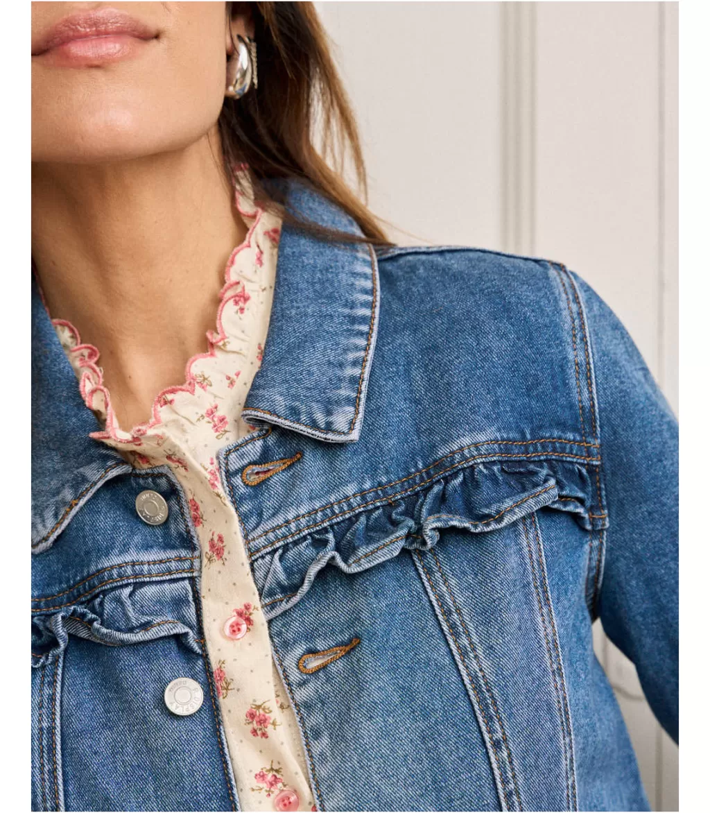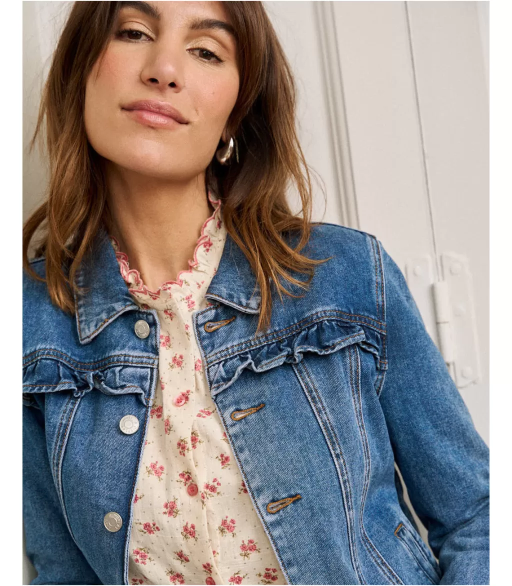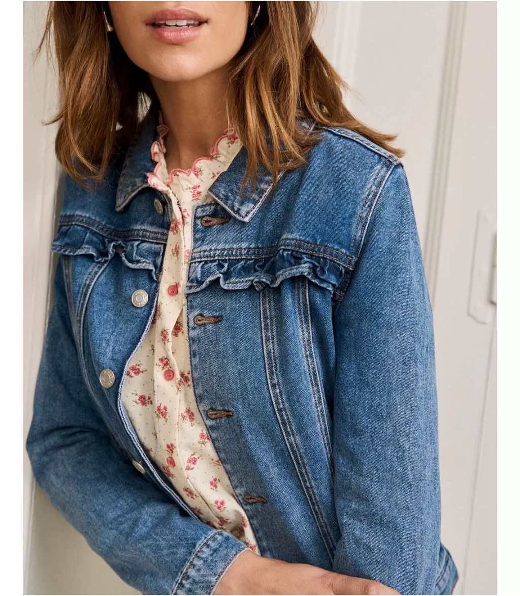 Cazadora vaquera en color denim. Cuello con solapas. Hilera de botones metálicos desde el cuello hasta el bajo. Detalle de volantes en el pecho y bolsillos laterales. Manga larga terminada en puño con botón. Cuerpo recto.