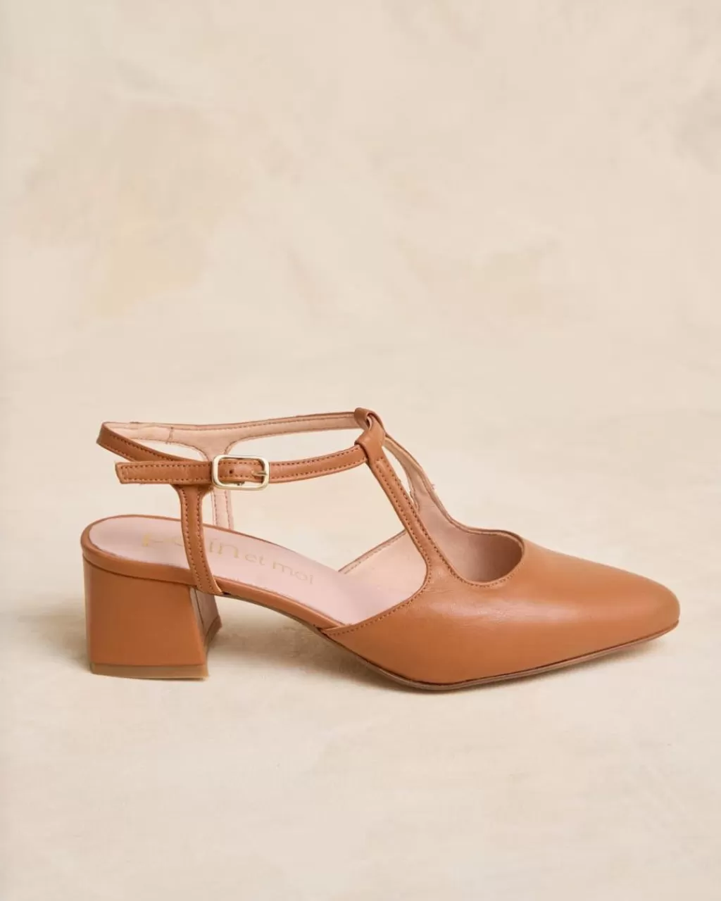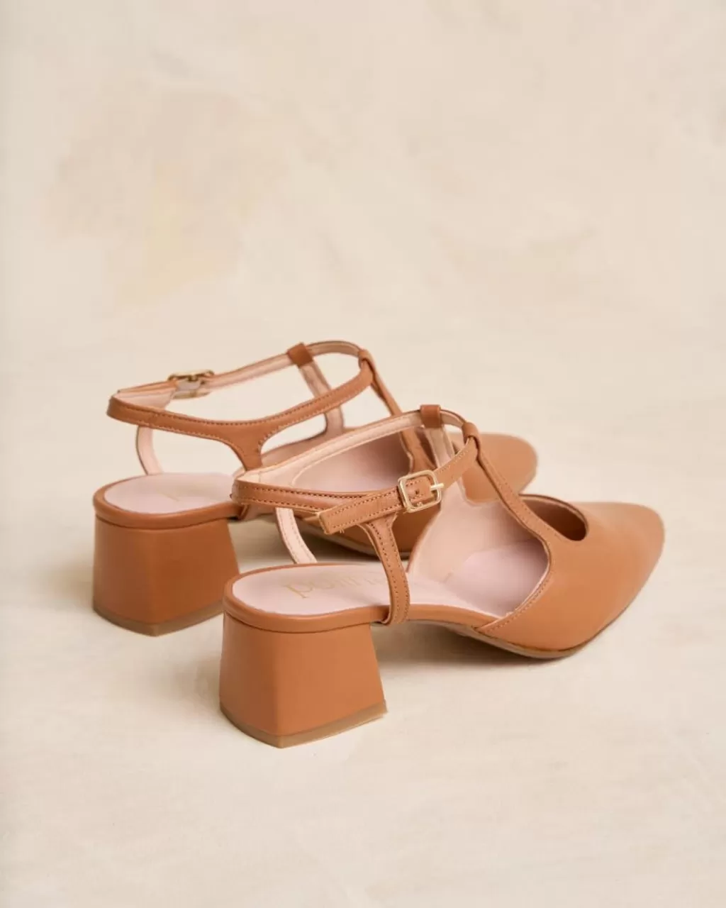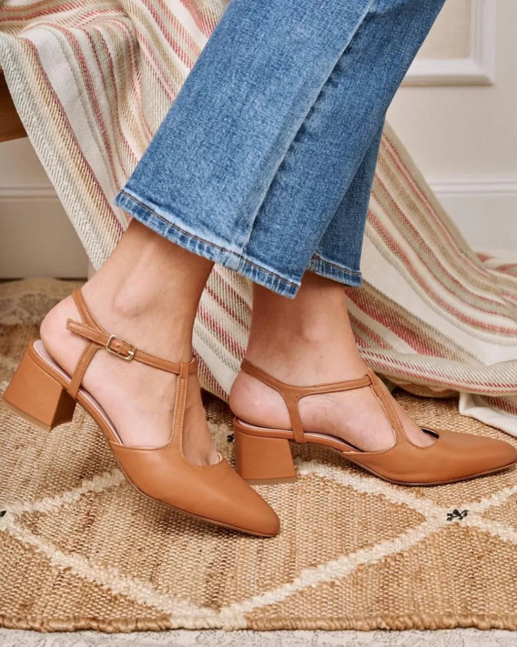 Zapato destalonado de piel en color cuero para tus eventos de esta temporada. Puntera cerrada ligeramente pronunciada. Detalle de cintas de piel en el empeine. Cierre al tobillo mediante correa regulable con hebilla cuadrada. Tacón bajo y cuadrado con acabado en el mismo tono que el resto del zapato. Un zapato muy femenino y cómodo.