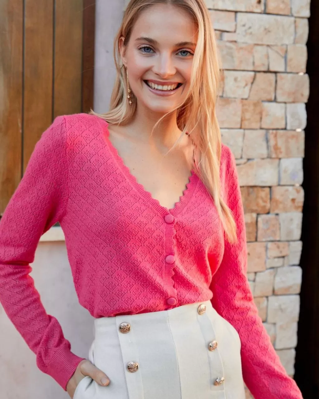 Jersey calada de punto fino en color rosa. Cuello ligeramente en pico con pequeñas ondas. Manga larga terminada ajustada terminada en puño. Diseño de cuerpo recto que se ajusta al cuerpo. Hilera de botones forrados desde el cuello hasta la goma del bajo. Un jersey con un color ideal para tus looks más alegres.