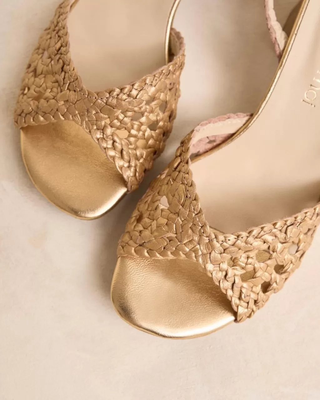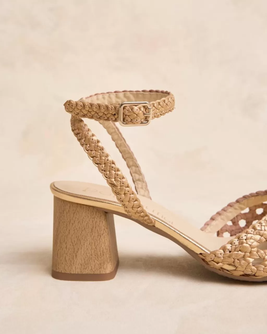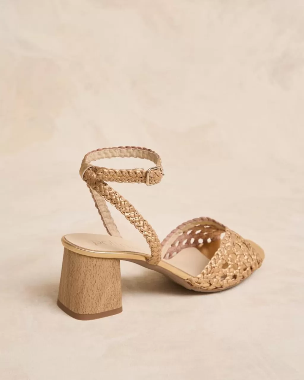 Sandalia de piel metalizada con acabado trenzado en tono oro. Escote en forma de mariposa. Puntera ligeramente puntiaguda con pequeña abertura. Sujeción al talón mediante una tira trenzada con hebilla para una cómoda regulación. Tacón con acabado en madera. Es una sandalia ideal y cómoda para combinar esta temporada con tus prendas favoritas.