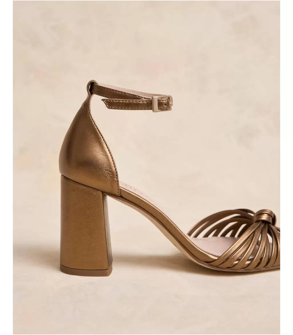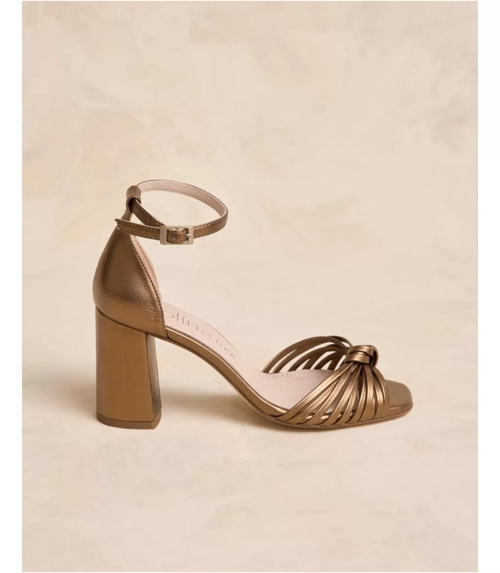 Sandalia con tiras en el empeine y nudo en color dorado. Diseño de múltiples tiras al tono en el empeine con nudo en el centro. Punta ligeramente cuadrada. Cierre al tobillo mediante correa regulable con hebilla cuadrada. Tacón ancho para mayor comodidad. Un zapato muy femenino y elegante para los eventos de esta temporada.