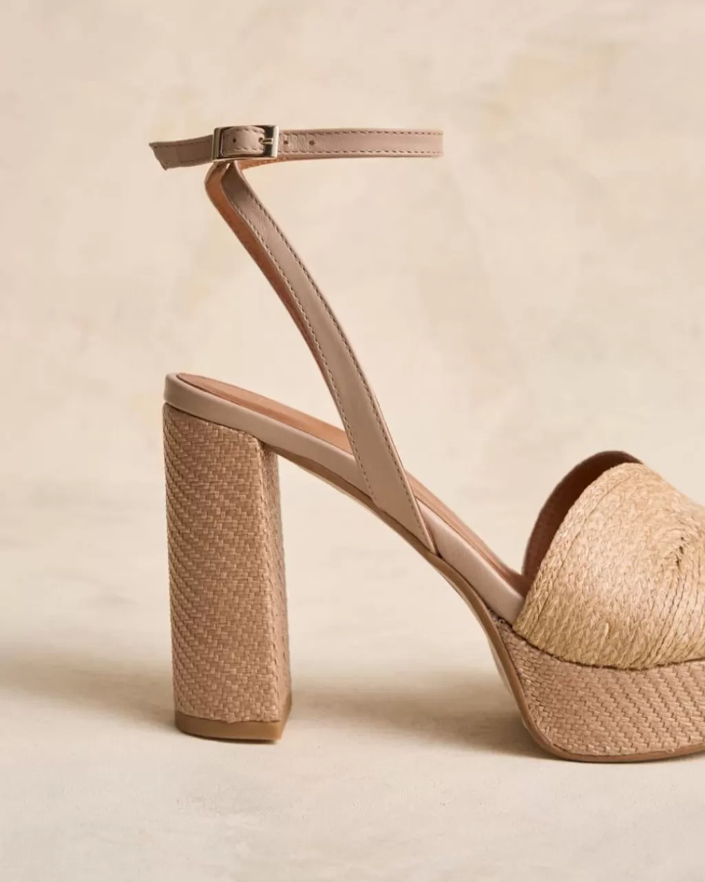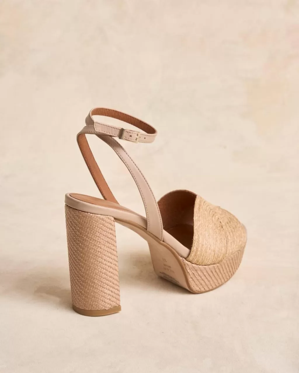 Sandalia de tacón de rafia en color beige. Punta redondeada y abierta. Escote corazón. Cierre en el empeine mediante correa regulable con hebilla cuadrada. Tacón ancho, cuadrado de rafia para mayor comodidad. Un zapato muy femenino y elegante para los eventos de esta temporada.