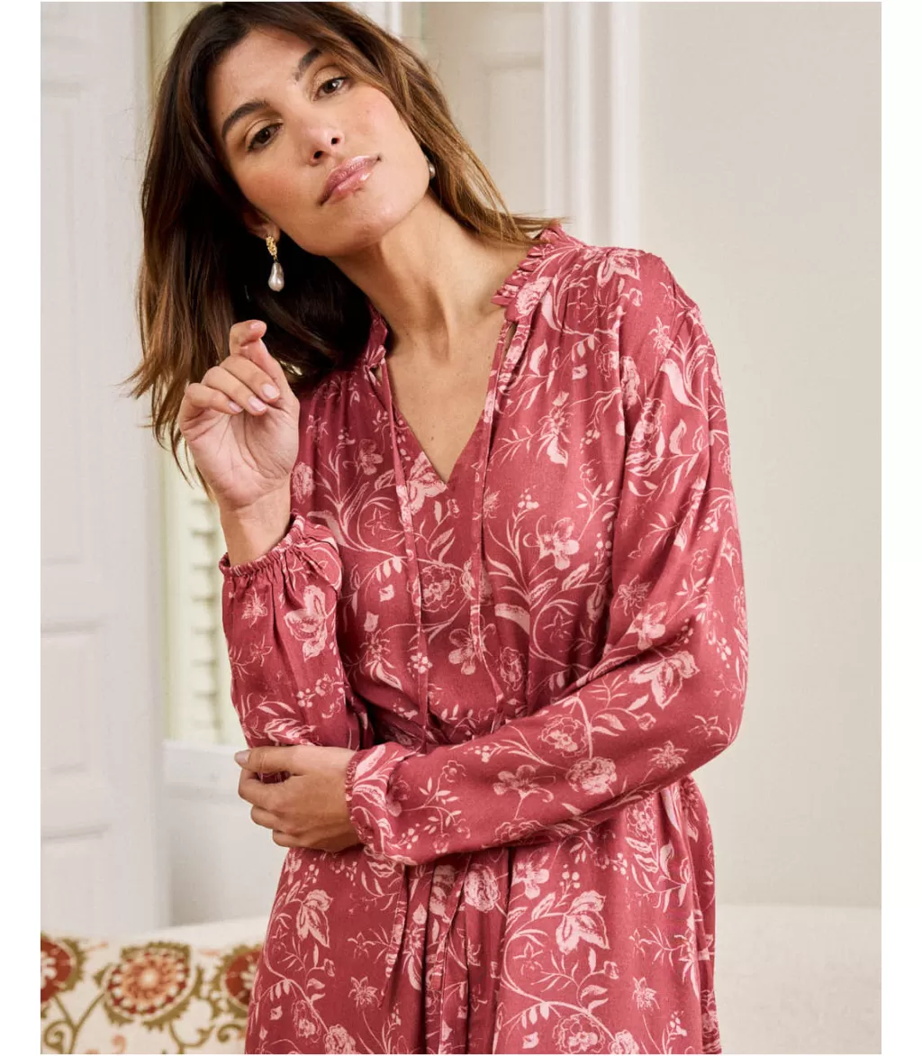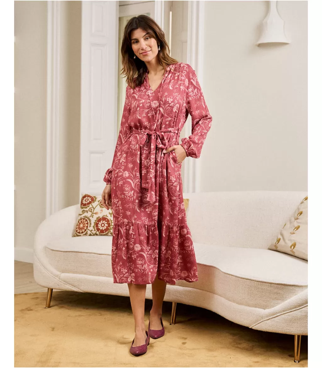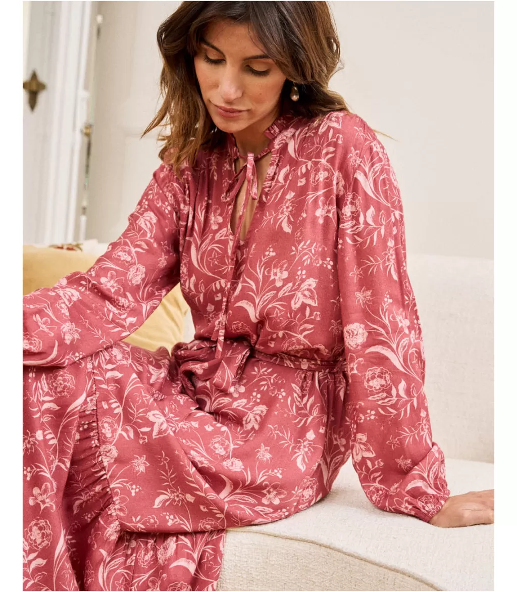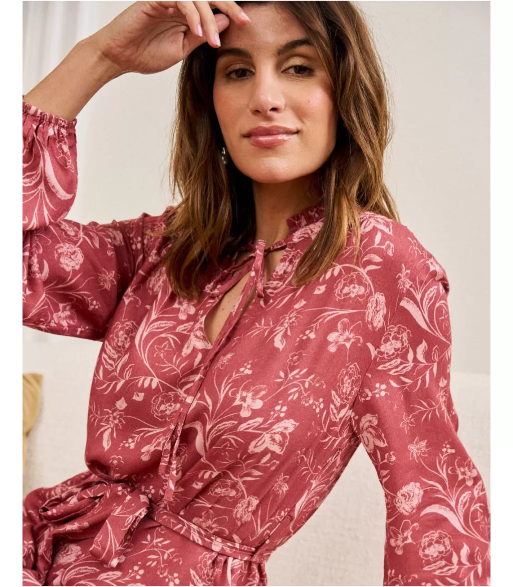 Vestido midi con estampado floral en tonos rosas y maquillajes. Vestido con cuello camisa con hilera de botones desde el escote hasta la cintura. Manga larga terminada en puño. Falda midi con un ligero volumen. Vestido ideal para la lactancia y el embarazo. Disfruta de tus mejores planes mientras luces uno de los colores de esta temporada.