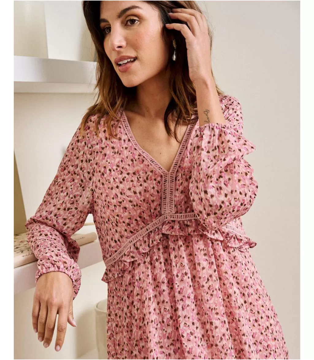 Vestido con corte babydoll corto con estampado floral en color rosa. Escote en pico con ribete. Modelo de manga larga terminado en Elástico. Corte con un pequeño volante bajo el pecho y elástico en la parte trasera de la cintura. Dispone de forro interior. Falda corta y con vuelo.