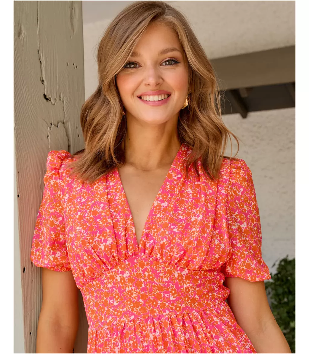 Vestido largo con estampado floral en color naranja. Escote en pico con corte bajo el pecho. Ligeramente ajustado a la cintura mediante elástico a la espalda. Diseño de manga corta ancha y elástico. Falda plisada. Dispone de forro interior. Tela ligera y vaporosa. Diseño ideal para la lactancia.