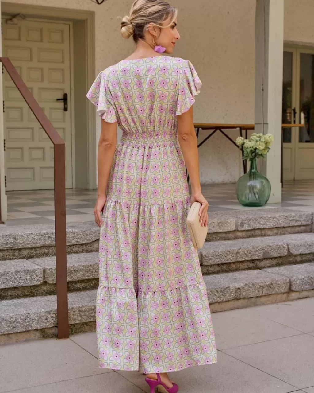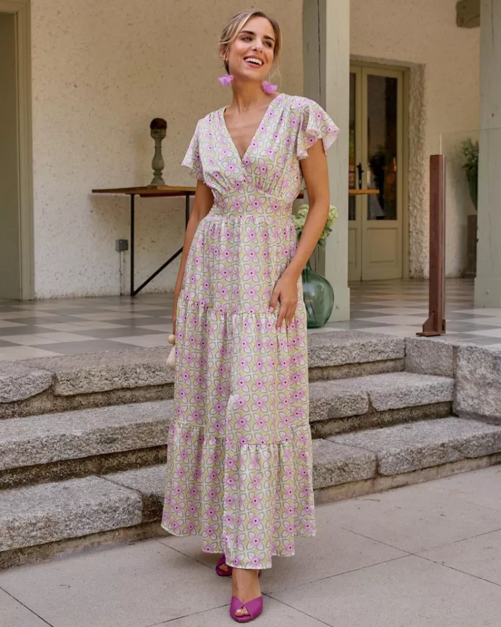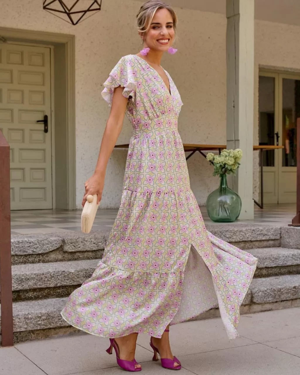 Vestido midi con estampado floral en color amarillo. Escote en pico y con la cintura ligeramente más ajustada con botones y con goma trasera para una mayor adaptación al cuerpo. Manga corta y amplia. Bajo del vestido con doble volante y abertura frontal para mayor vuelo y movimiento. Es un vestido ideal y muy favorecedor para los eventos de la temporada.