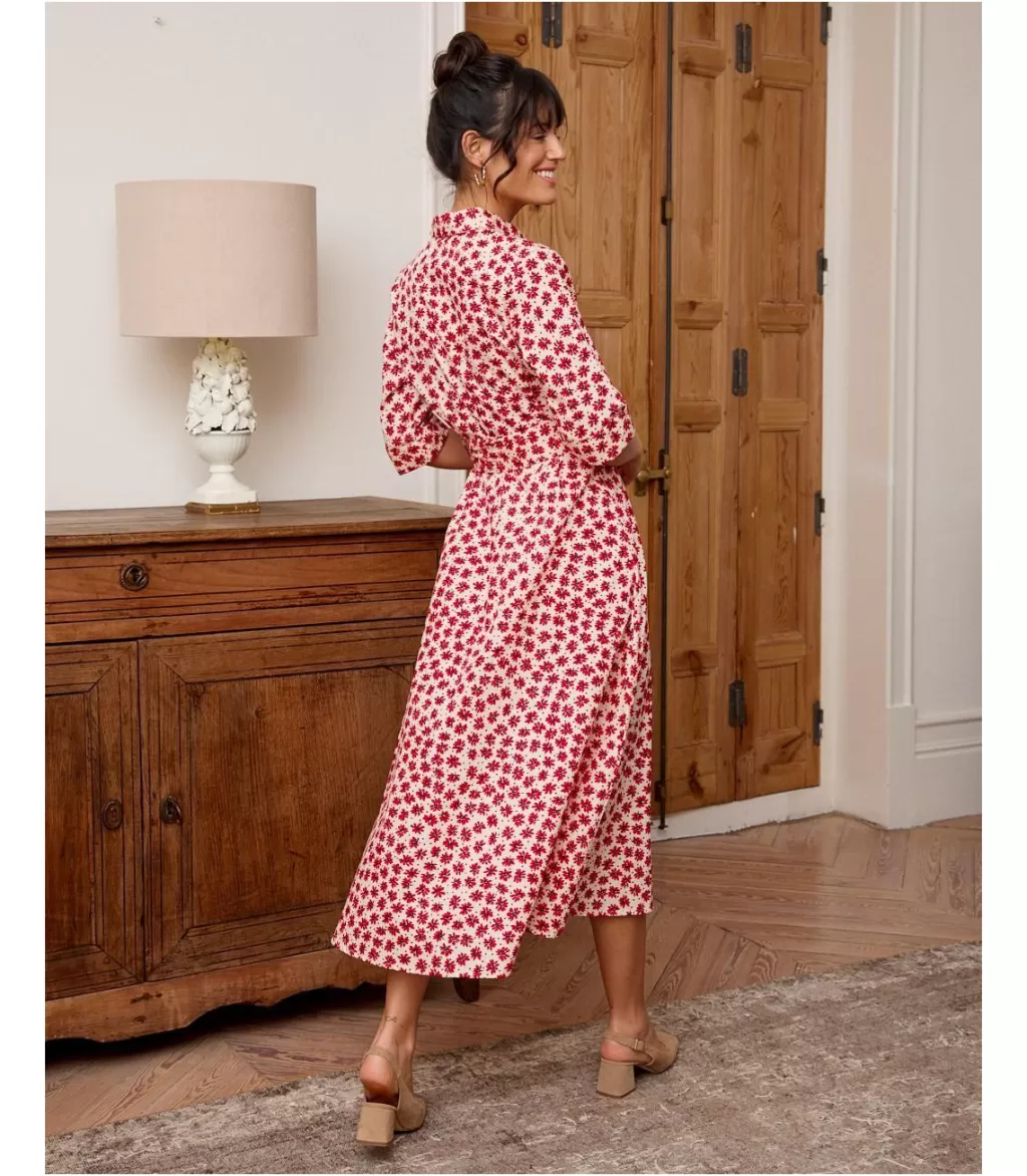 Vestido camisero largo con estampado floral sobre un fondo en color rojo. Vestido con cuello de camisa. Cinturón a juego en la cintura. Manga corta. Hilera de botones desde el cuello hasta el bajo. Falda larga, ligeramente acampanada, con abertura central. Vestido ideal para la lactancia.