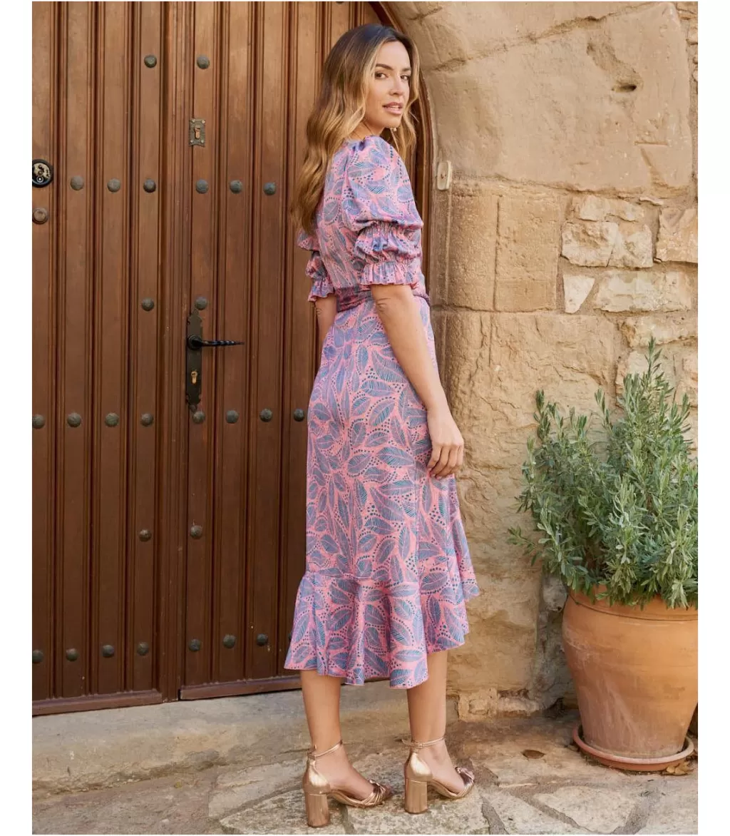 Vestido midi con estampado de plumas. Escote en pico y con la cintura ligeramente más ajustada con goma trasera para una mayor adaptación al cuerpo. Manga francesa con elástico y volante al final. Bajo del vestido con un gran volante. Incluye forro interior. Un vestido ideal para las invitadas con un toque de color muy especial.Vestido de invitada con un coste de devolución especial de 3,95€ que será descontado del importe total a devolver.