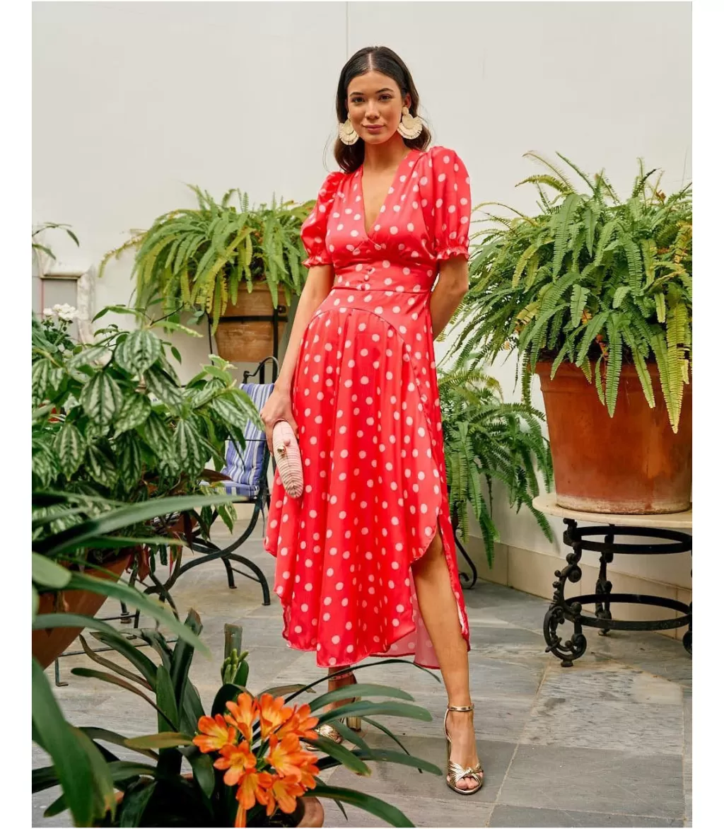 Vestido largo con estampado de lunares en color cereza. Escote en pico. Cintura ligeramente más estrecha con elástico trasero. Botonadura forrada debajo del pecho. Manga corta ancha. Falda asimétrica con vuelo. Un vestido muy especial con un color muy favorecedor para disfrutar de los eventos de esta temporada.