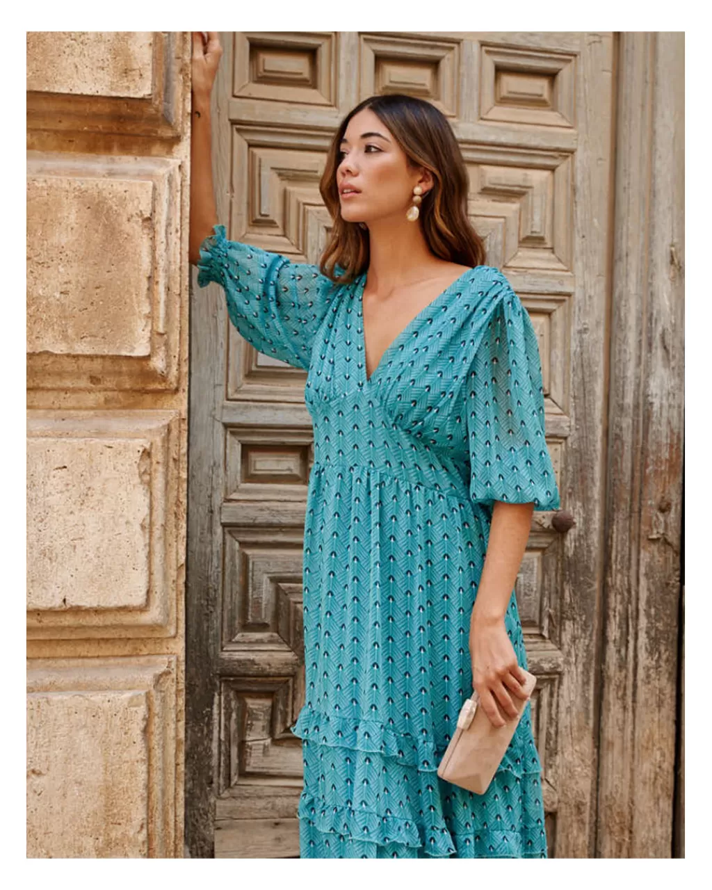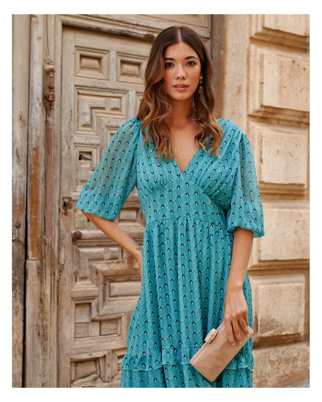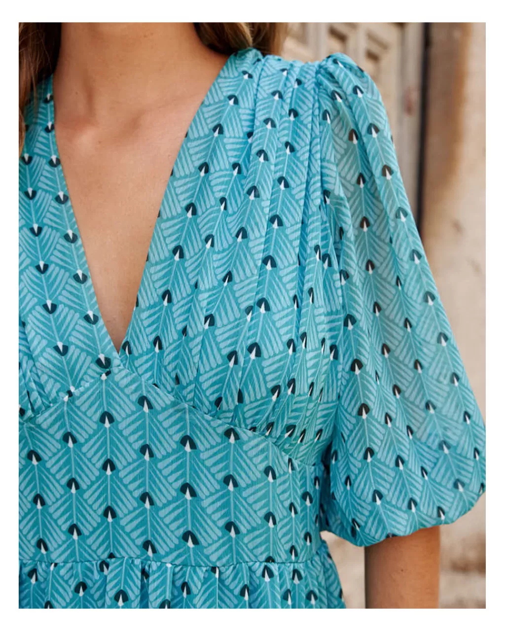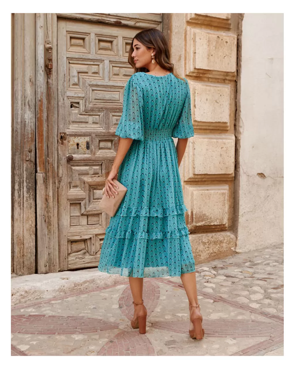 Vestido midi con estampado de manchas en color verde menta. Escote en pico con ligero pliegue en el pecho. Corte en la cintura con franja elástica en la espalda. Falda recta con dos tiras de volantes en el bajo. Manga terminada en elástico con pequeño volante. Incluye forro interior.