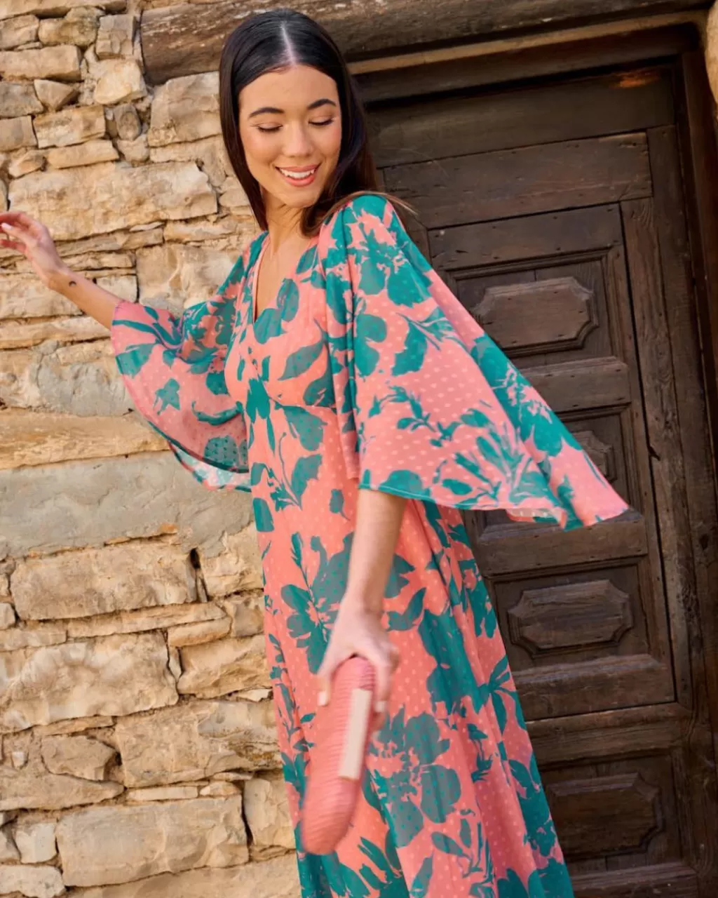 Vestido largo con estampado floral. Escote en pico. Corte bajo el pecho. Manga ancha, tres cuartos e irregular. Falda con ligero vuelo. Tela ligera y vaporosa. Un vestido con un diseño muy romántico para los eventos de esta temporada.Vestido de invitada con un coste de devolución especial de 3,95€ que será descontado del importe total a devolver.
