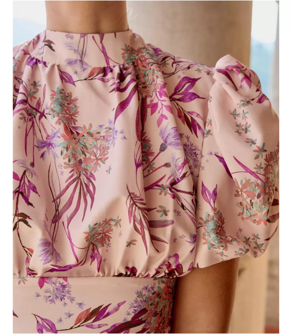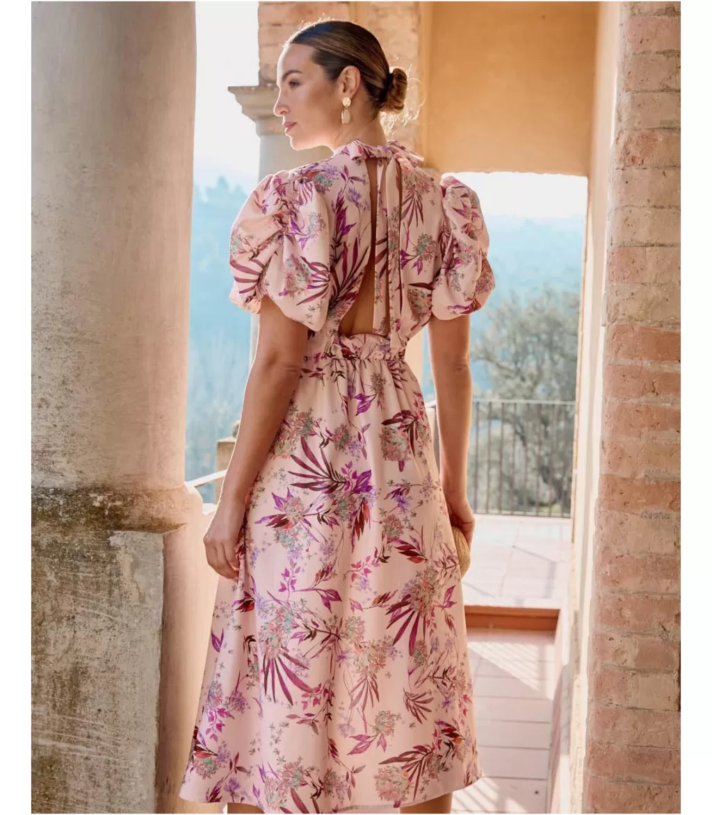 Vestido midi con estampado. Escote redondo con cuello estilo perkins y ligeros pliegues en la zona del pecho. Escote en espalda con lazo superior. Corte en cintura con franja elástica trasera. Manga corta y abullonada, terminada en elástico. Diseño de cuerpo recto.