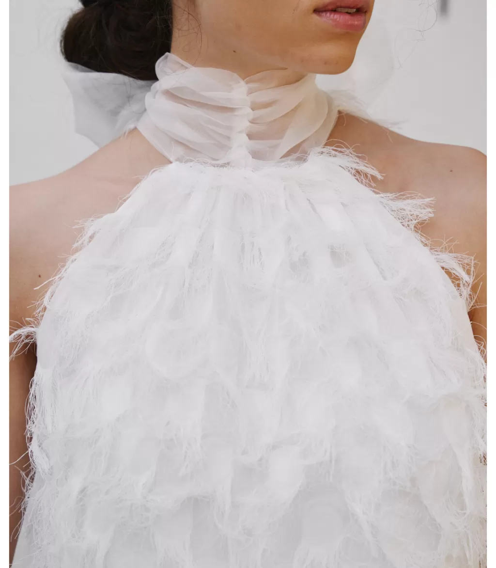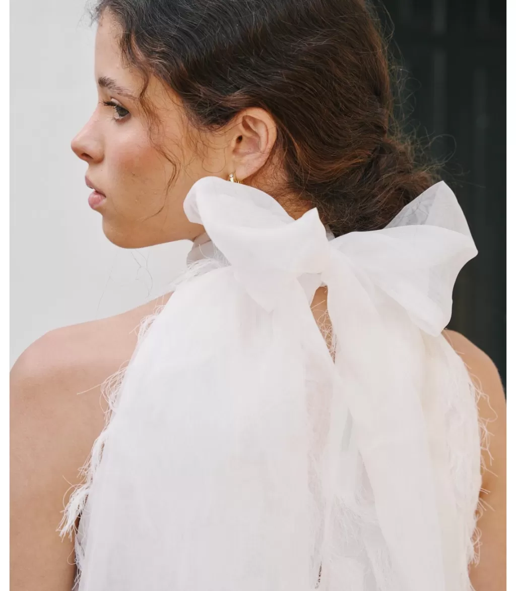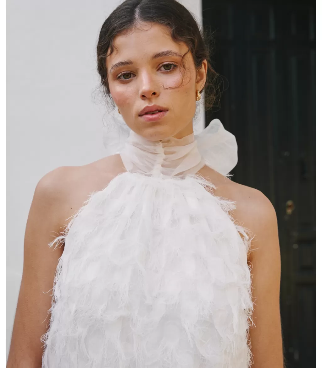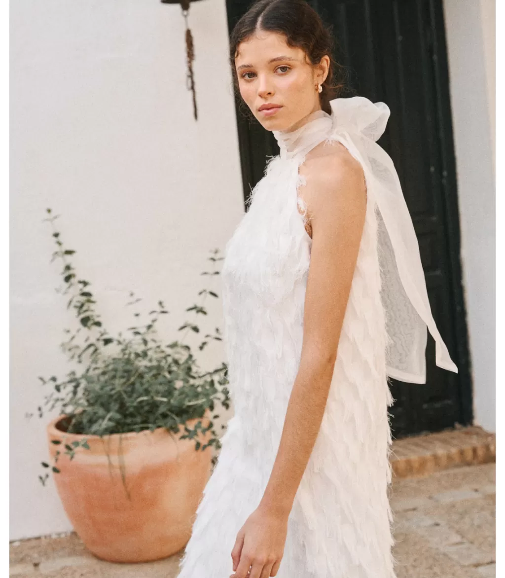 La seducción y el intenso amor de esta flor da forma a este vestido de novia largo, en color blanco, elaborado en un delicado tejido con pequeños y finos flecos de hilo. Cuello redondo en tul del que nacen dos largas tiras para anudar al cuello y dejar caer el sobrante del lazo. Diseño sin mangas. Lazada al cuello con el que elaborar un bonito lazo a gusto. Vestido de corte recto y falda larga hasta el suelo. El vestido de novia Dalia incluye forro interior.