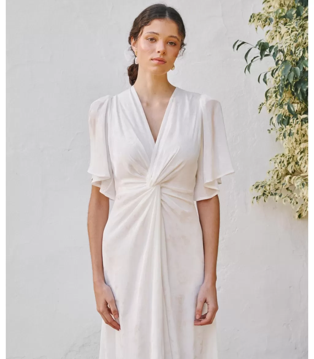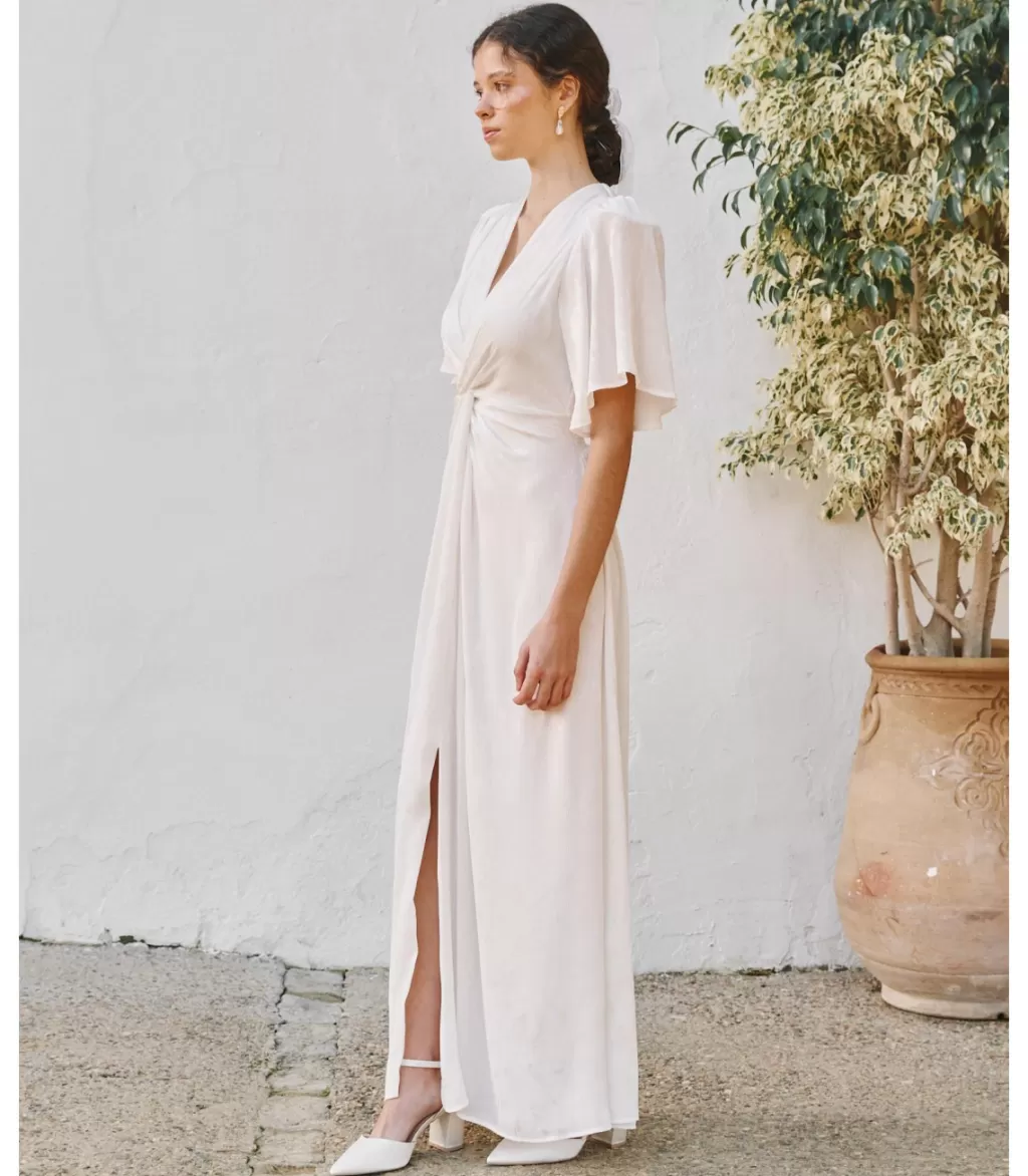 La alegría y el aroma cálido de la belleza delicada del jazmín te envuelve en este vestido de novia largo en color blanco elaborado en tejido jacquard. Escote en pico con corte bajo el pecho en forma de nudo con discretos pliegues. Manga corta, ancha y estilo murciélago. Falda larga recta con pequeña abertura central que facilita el movimiento y se une junto con el nudo frontal. El vestido de novia Jazmín incluye forro interior.