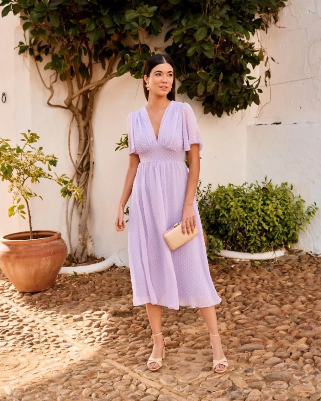 Vestido en color lila con detalle de topos en relieve. Escote en pico, con detalle de cintura lisa, debajo del pecho. Manga corta fluida. Cintura ligeramente más ajustada con goma para una mayor adaptación al cuerpo. Falda del vestido fluida, con bajo recto. Un vestido ideal para las invitadas con un toque de color muy especial. Vestido también perfecto para el embarazo y la lactancia.