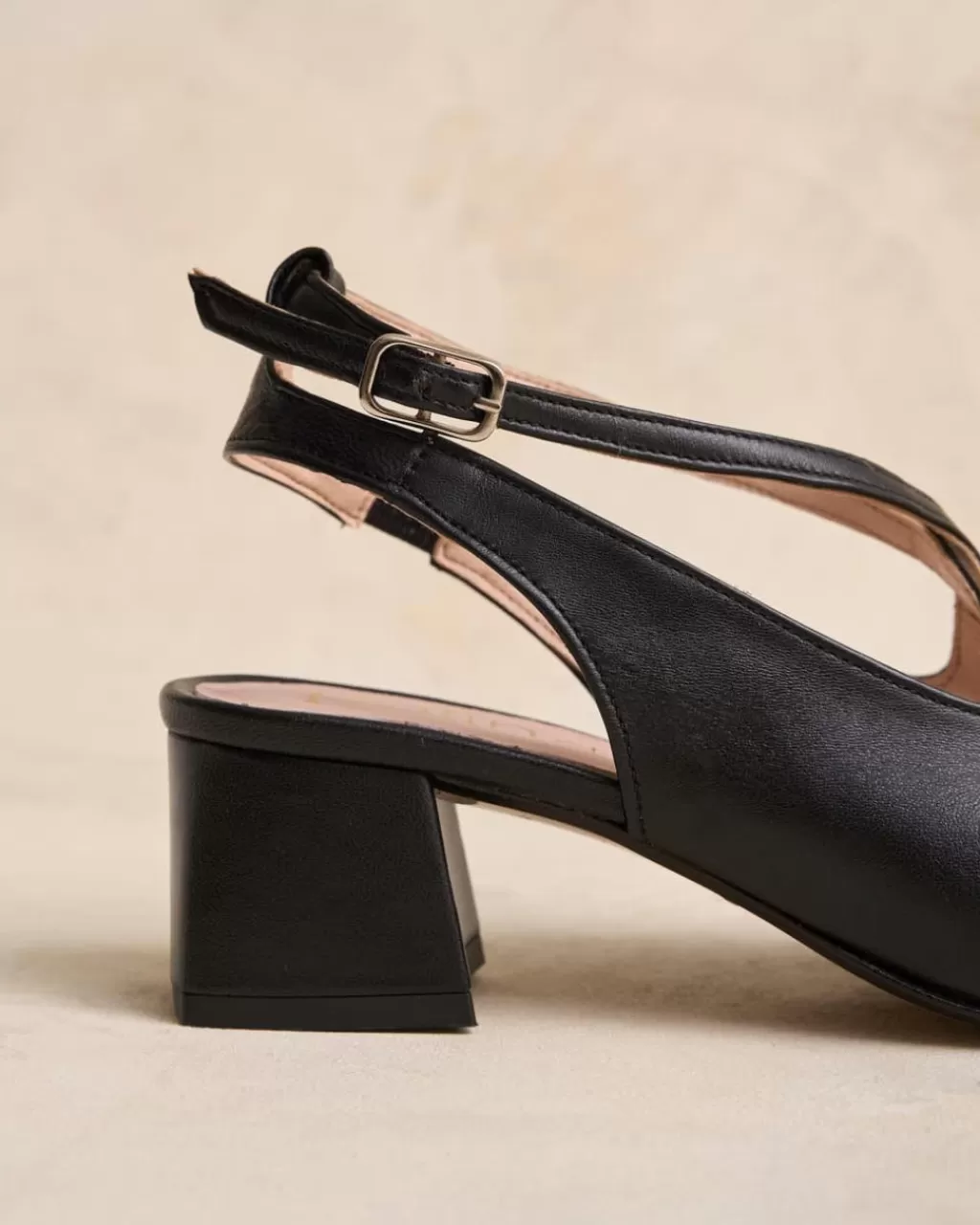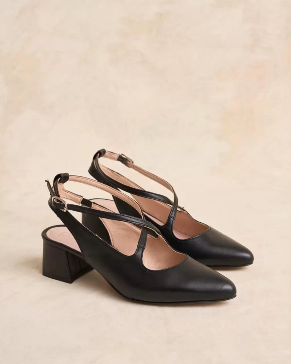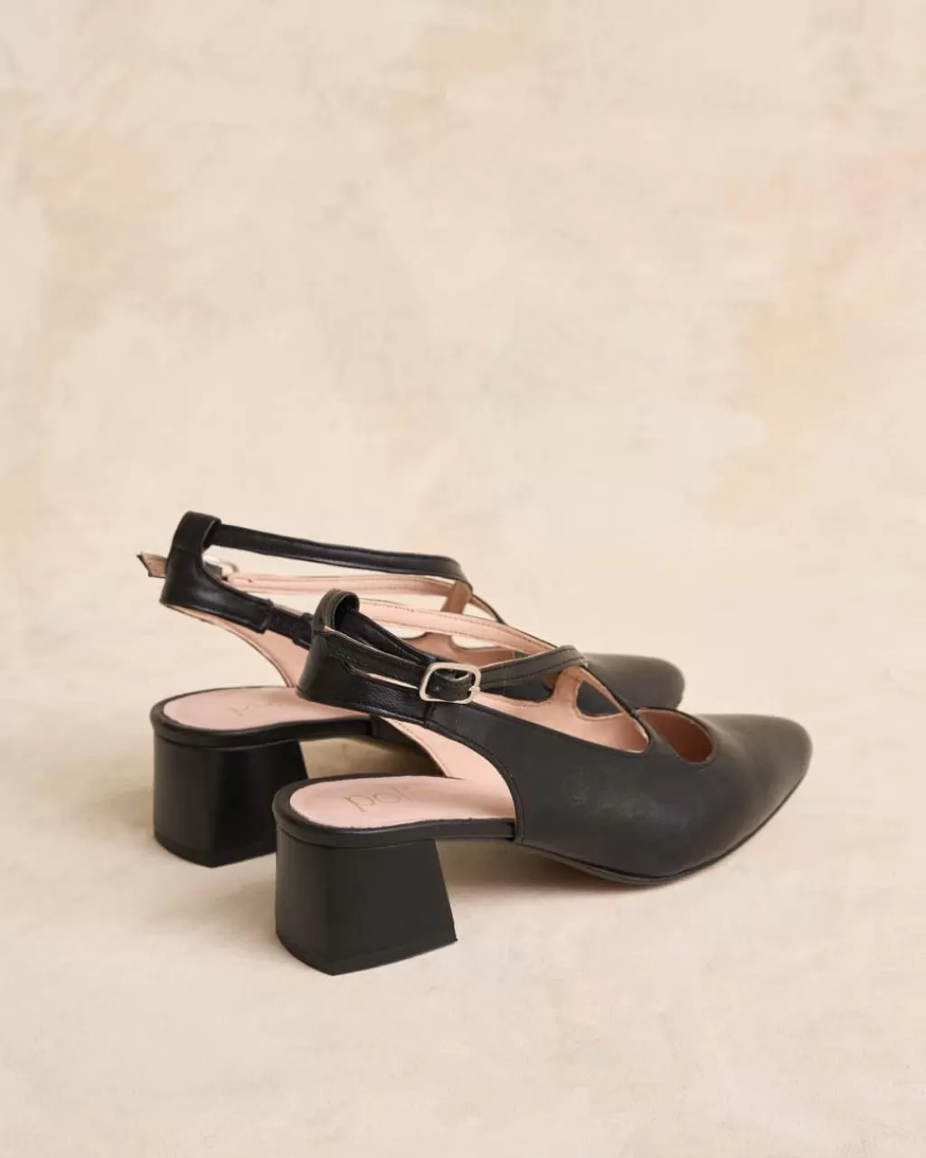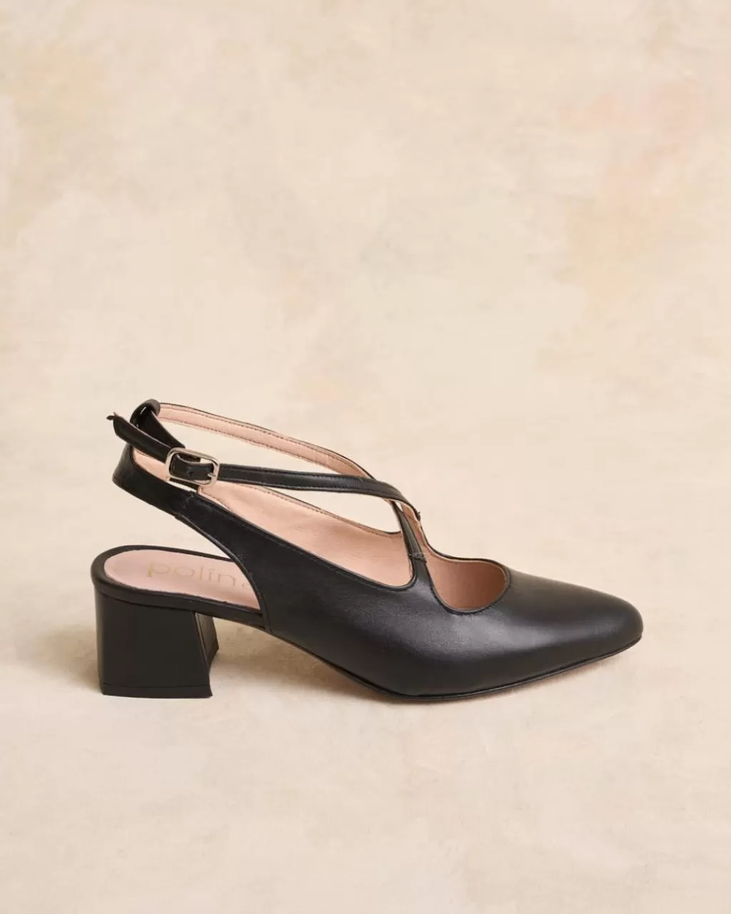 Zapato destalonado de piel en color negro para tus eventos de esta temporada. Puntera cerrada ligeramente pronunciada. Detalle de cintas de piel cruzadas en el empeine. Cierre al tobillo mediante correa regulable con hebilla cuadrada. Tacón bajo y cuadrado con acabado en el mismo tono que el resto del zapato. Un zapato muy femenino y cómodo.