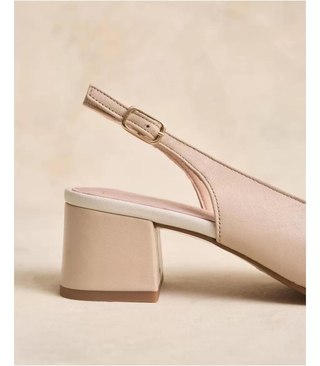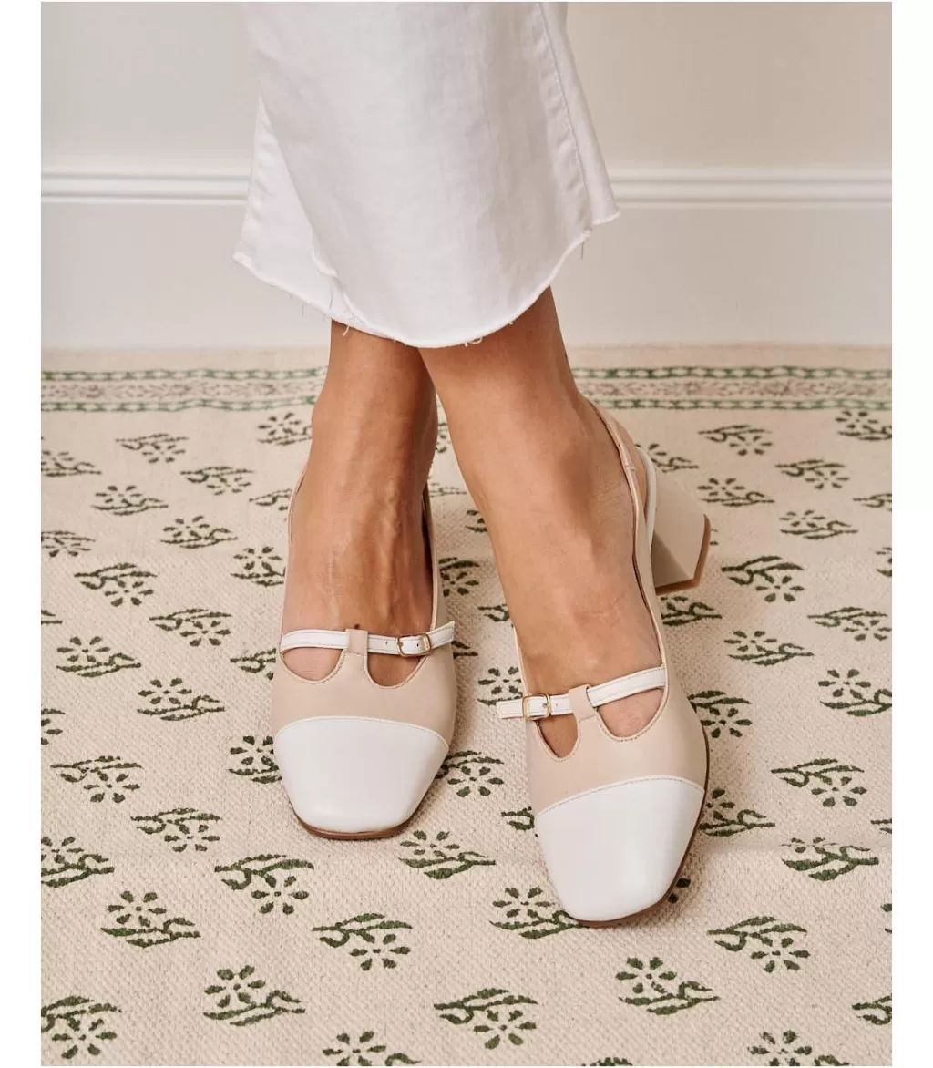 Zapato de piel destalonada en color piedra. Puntera ligeramente cuadrada en color crudo. Correa regulable con hebilla al talón. Tacón cuadrado. Es un calzado diferente y cómodo para combinarlo tanto con pantalones como con vestidos.